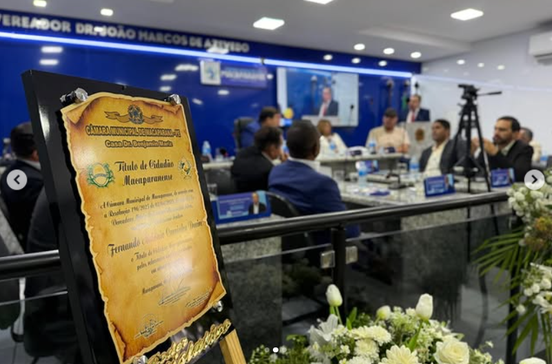 Autoridades, vereadores e representantes da sociedade participaram da sessão solene realizada na Câmara Municipal de Macaparana, ocasião em que o senador Fernando Dueire foi homenageado com o Título de Cidadão Macaparanense.