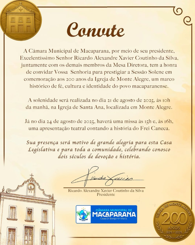 A Câmara Municipal de Macaparana tem a honra de convidar toda a comunidade para a Sessão Solene em comemoração ao bicentenário da Igreja de Monte Alegre, um verdadeiro patrimônio histórico e cultural que atravessa gerações, sendo símbolo de devoção e identidade do nosso povo.